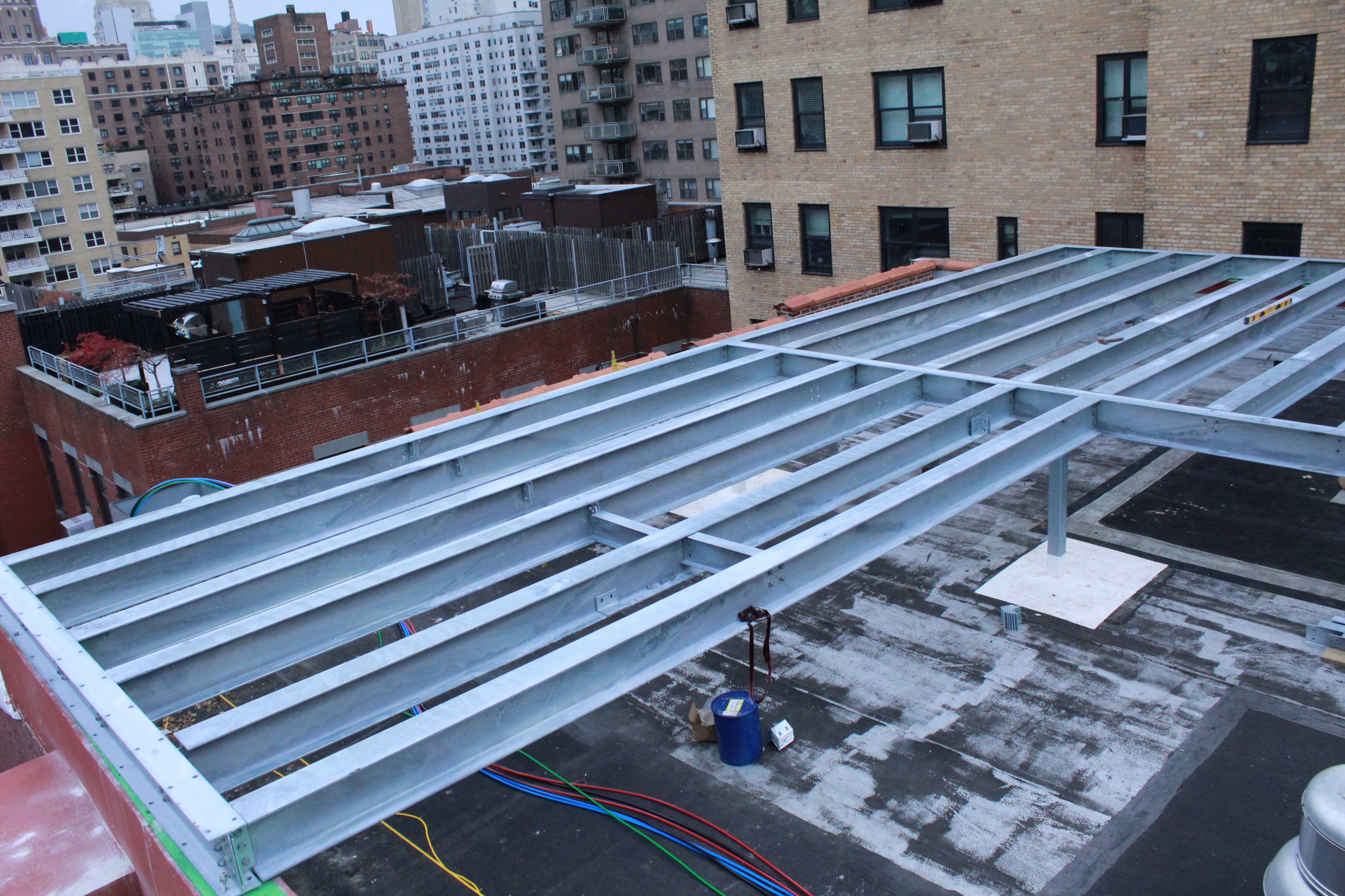 The final installation provides a stable, constructible support system that aligns with existing parapet walls and interior columns, allowing the building to accommodate new equipment while maintaining its structural integrity.